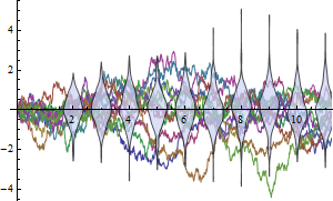 plot1 = ListLinePlot[paths["Part", 1 ;; 12]]; plot2 = DistributionChart[ Transpose@(paths["SliceData", Range[0, 4 Pi, 1.1]]), ChartStyle -> Opacity[0.7]]; Show[plot1, plot2, PlotRange -> {{0, 11}, Automatic}, ImageSize -> 300]