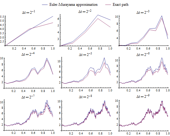 Приближение Эйлера-Маруямы траектории процесса геометрического Броуновского движения относительно данной траектории процесса Винера, сопоставленная с точной траекторией.