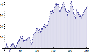 SeedRandom[456346435]; data = RandomFunction[ARIMAProcess[{.3}, 1, {.2}, 1], {0, 250}][ "PathStates"]; ListPlot[data, Filling -> Axis, ImageSize -> 300]