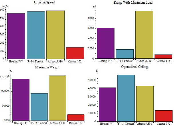 Grid[{{ BarChart[Cases[aircraftdata, {"cruise speed", {x_, _}} :> x, -1], ChartStyle -> "Rainbow", ChartLabels -> aircraft, AxesLabel -> Automatic, PlotLabel -> "Cruising Speed", ImageSize -> 300], BarChart[ Cases[aircraftdata, {"range with maximum load", {x_, _}} :> x, -1], ChartStyle -> "Rainbow", ChartLabels -> aircraft, AxesLabel -> Automatic, PlotLabel -> "Range With Maximum Load", ImageSize -> 300] }, { BarChart[Cases[aircraftdata, {"maximum weight", {x_, _}} :> x, -1], ChartStyle -> "Rainbow", ChartLabels -> aircraft, AxesLabel -> Automatic, PlotLabel -> "Maximum Weight", ScalingFunctions -> "Log", ImageSize -> 300], BarChart[Cases[aircraftdata, {"operational ceiling", x_} :> x, -1], ChartStyle -> "Rainbow", ChartLabels -> aircraft, AxesLabel -> Automatic, PlotLabel -> "Operational Ceiling", ImageSize -> 300] }}]