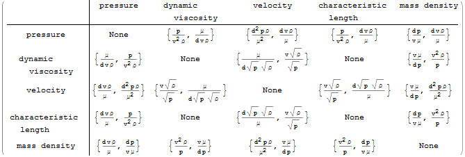 BPTMatrixLabels = {"pressure", "dynamic viscosity", "velocity", "characteristic length", "mass density"}; P = Quantity[p, "Newtons"/"Meters"^2]; mu = Quantity[\[Mu], ("Pascals"*"Seconds")]; V = Quantity[v, "Meters"/"Seconds"]; L = Quantity[d, "Meters"]; Rho = Quantity[\[Rho], "Kilograms"/"Meters"^3]; terms = {P, mu, V, L, Rho};