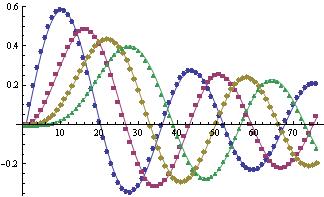 In[1]:= | ListPlot[Table[BesselJ[n, x], {n, 4}, {x, 0, 15, .2}],