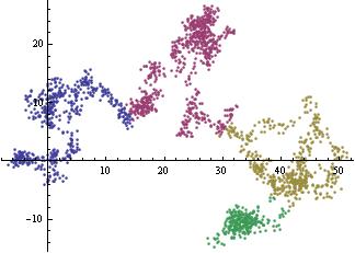 In[1]:= | ListPlot[FindClusters[Accumulate[RandomReal[{-1, 1}, {2000, 2}]], 4],