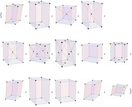 Mathematica 6 has immediately available more than 35 properties of standard lattices in any number of dimensions. This shows the Bravais lattices.
