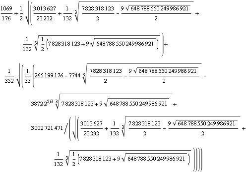 In[1]:= | RootApproximant[N[\[ExponentialE]^\[Pi], 18], 4] // ToRadicals // TraditionalForm |
