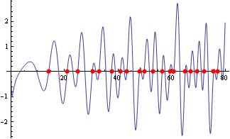 In[1]:= | Plot[Im[Zeta[1/2 + I t]], {t, 0, 80},