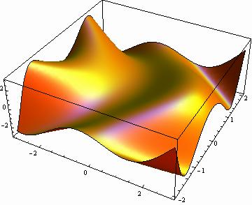 In[1]:= | Plot3D[x Sin[x + y^2], {x, -3, 3}, {y, -2, 2},