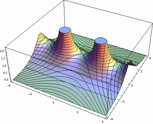 In[1]:= | Plot3D[Abs[Sec[x + I y]], {x, -4, 4}, {y, -4, 4},