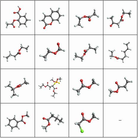 In[1]:= | GraphicsGrid[ Partition[ ChemicalData[#, "MoleculePlot"] & /@ Take[ChemicalData["Ester"], 16], 4], Frame -> All] |