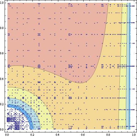 Mathematica 6 uses a combination of novel adaptive symbolic and numerical methods to efficiently handle a wide range of singularities. This shows the sample points used in a 2D singular integral.