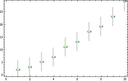 In[1]:= | ListPlot[Table[Prime[n], {n, 10}],