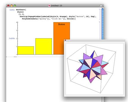 BarChart[{1, 2, Tooltip[PopupWindow[ Labeled[Style[4, Orange], Style["Button", 16], Top], PolyhedronData["Spikey"]], "Click me!"]}, ChartStyle -> Yellow]
