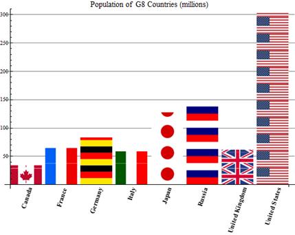 BarChart[data, ChartElements -> CountryData["G8", "Flag"], GridLines -> {None, Automatic}, PlotLabel -> Style["Population of G8 Countries (millions)", "Title", FontSize -> 14]]