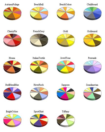 GraphicsGrid[ Partition[ Table[PieChart3D[Range[12], ChartStyle -> i, PlotLabel -> ColorData[i, "PrivateStandardNames"][[1, 2]]], {i, 44, 62, 1}], 4, 4, 1, ""]]
