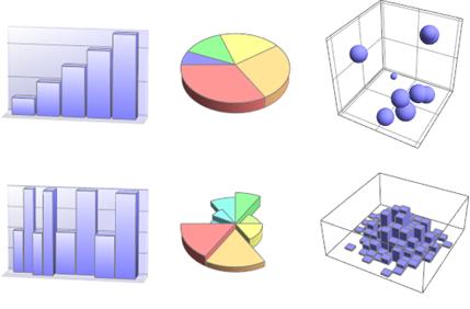 GraphicsGrid[{{BarChart3D[Range[5], Axes -> None], PieChart3D[Range[5]], BubbleChart3D[RandomReal[1, {10, 4}], Axes -> None]}, {RectangleChart3D[Tuples[{1, 2}, 3], Axes -> None], SectorChart3D[Tuples[{1, 2}, 3]], Histogram3D[RandomReal[NormalDistribution[0, 1], {500, 2}], Axes -> None]}}]