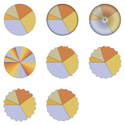 GraphicsGrid@ Partition[ Table[PieChart[Range[5], ChartElementFunction -> f, ChartStyle -> 46], {f, {"Sector", "PlateauSector", "GlassSector", "GradientSector", "NoiseSector", "OscillatingSector", "SquareWaveSector", "TriangleWaveSector"}}], 3, 3, 1, ""]