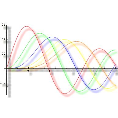 DropShadow[ Plot[Evaluate[Table[BesselJ[n, x], {n, 5}]], {x, 0, 10}, PlotStyle -> {Red, Green, Blue, Yellow, Orange}]]