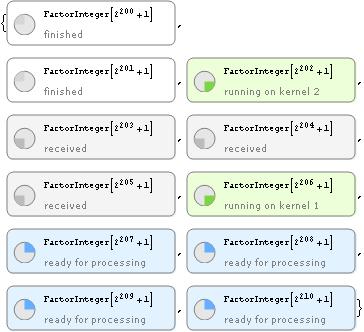 You can submit evaluations to the parallel processing queue with ParallelSubmit. You can harvest the results with WaitAll and WaitNext. The EvaluationObject that is returned by ParallelSubmit automatically displays the state of the evaluation, allowing you to monitor its progress.