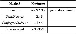 Mathematica 7 lets you run a command with a number of different inputs, stopping when a result is obtained. In the following a minimization command is run using several different methods. The first one to finish is used and the others are canceled. The computation is then repeated using all the methods; a table shows all the results along with the result of the speculative result.