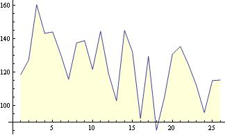 ListPlot[Variance /@ Partition[ WeatherData["KORD", "MeanTemperature", {{1975}, {2000}, "Day"}, "Value"], 365], PlotRange -> All, Joined -> True, Filling -> Axis, FillingStyle -> LightYellow]