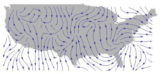 Show[Graphics[{GrayLevel[.7], CountryData["USA", "Polygon"]}], ListStreamPlot[ Table[{{x, y}, -Through[{Sin, Cos}[ WeatherData[{y, x}, "WindDirection"] \[Degree]]]}, {x, -125, -67, 4}, {y, 24, 50, 4}]]]