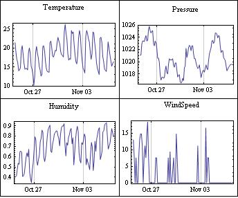 Grid[Partition[ DateListPlot[ WeatherData[ "Athens", #, {DatePlus[DateList[], -14], DateList[]}], Joined -> True, PlotLabel -> #] & /@ {"Temperature", "Pressure", "Humidity", "WindSpeed"}, 2], Frame -> All]