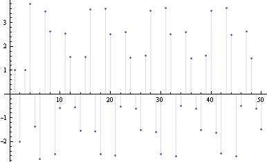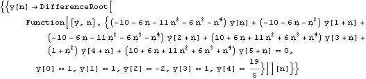 RSolve[y[n + 2] + 1/( n^2 + 1) y[n + 1] + y[n] == Mod[n, 3] && y[0] == y[1] == 1, y[n], n]; DiscretePlot[Evaluate[y[n] /. First[%]], {n, 0, 50}]
