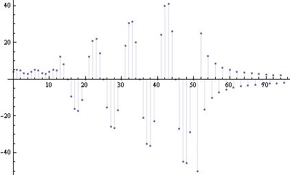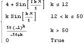 pw = Piecewise[{{4 + Sin[k 2 Pi/5], k <= 12}, {k Sin[k 2 Pi/10], 12 < k <= 50}, {50 (-1)^k/(k - 50), k > 50}}]