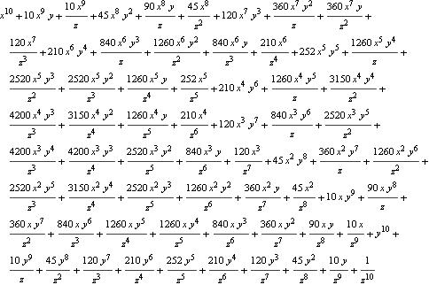 TraditionalForm[Expand[(x + y + 1/z)^10]]