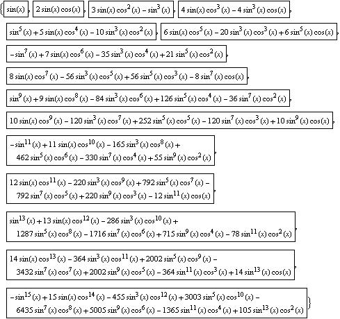 TraditionalForm[Table[Framed[TrigExpand[Sin[n x]]], {n, 15}]]