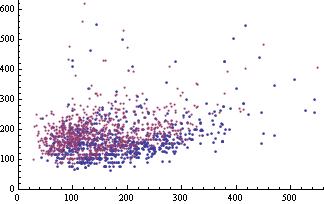 data = Outer[ ChemicalData, {ChemicalData["Alcohols"], ChemicalData["Esters"]}, {"BoilingPoint", "MolecularWeight"}]; ListPlot[data, PlotStyle -> PointSize /@ {.009, .007}, PlotRange -> {{0, All}, {0, All}}]
