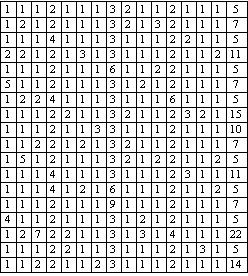 Text @ TraditionalForm @ Grid[Partition[Table[FiniteAbelianGroupCount[n], {n, 300}], 16], Frame -> All, ItemSize -> Full]