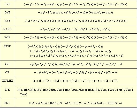 Grid[{#, BooleanConvert[ Implies[Xor[a, b, c, d, e], Nand[a && b, c || d || ! e]], #]} & /@ {"CNF", "DNF", "ANF", "NAND", "NOR", "ESOP", "AND", "OR", "IMPLIES", "ITE", "BDT"}, Frame -> All, Spacings -> {1, 2}, Background -> LightYellow] // TraditionalForm