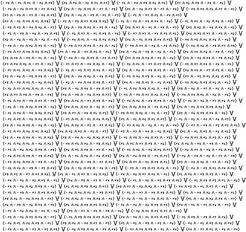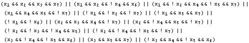 vars = Array[Subscript[x, #] &, 7]; lits = Join[vars, Not /@ vars]; SeedRandom[0]; Style[TraditionalForm[ expr = Or @@ Table[And @@ RandomSample[lits, 5], {150}]], 6]