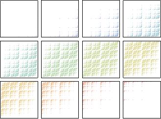 Partition[ Table[ArrayPlot[ BooleanTable[BooleanCountingFunction[{i}, 14] @@ Array[x, 14], Array[x, 7], Array[x, 7, 8]], ColorRules -> {False -> None, True -> ColorData["Rainbow"][i/12]}], {i, 1, 12}], 4] // GraphicsGrid