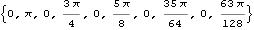 Table[\!\( \*SubsuperscriptBox[\(\[Integral]\), \(0\), \(2\ \[Pi]\)]\( SuperscriptBox[\(Sin[x]\), \(n\)] \[DifferentialD]x\)\), {n, 10}]