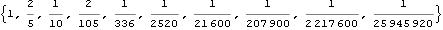 data = {1, 2/5, 1/10, 2/105, 1/336, 1/2520, 1/21600, 1/207900, 1/ 2217600, 1/25945920};