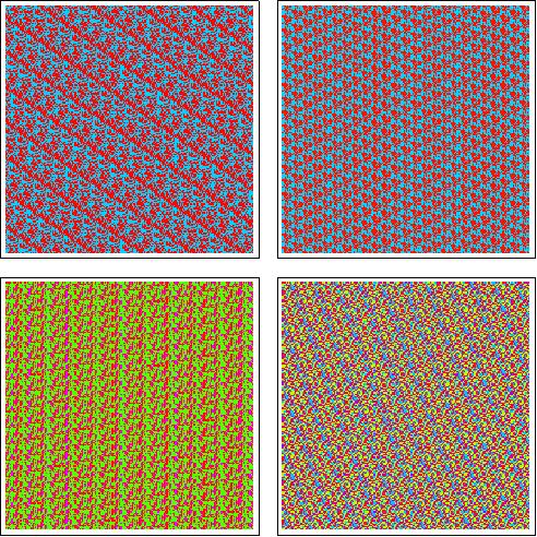GraphicsGrid[{{PeriodicTexture[ Table[LiouvilleLambda[k], {k, 282}], {200, 200}], PeriodicTexture[ Table[LiouvilleLambda[k], {k, 88}], {200, 200}]}, {PeriodicTexture[ Table[PrimeNu[k], {k, 260}], {200, 200}], PeriodicTexture[Table[PrimeOmega[k], {k, 255}], {200, 200}]}}]