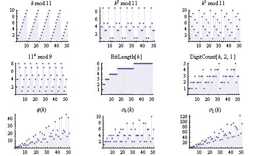 GraphicsGrid@ Partition[ Table[DiscretePlot[f, {k, 50}, PlotLabel -> f], {f, {Mod[k, 11], Mod[k^2, 11], Mod[k^3, 11], Mod[11^k, 9], BitLength[k], DigitCount[k, 2, 1], EulerPhi[k], DivisorSigma[0, k], DivisorSigma[1, k]}}], 3]