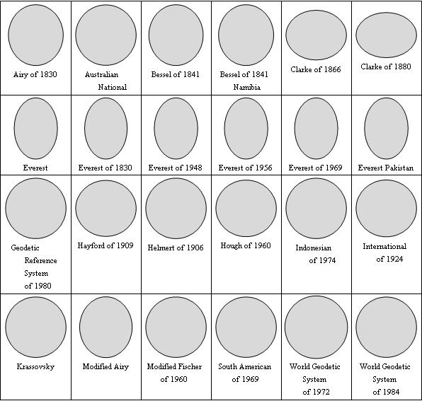 Exaggerated differences between common reference ellipsoids and WGS84.