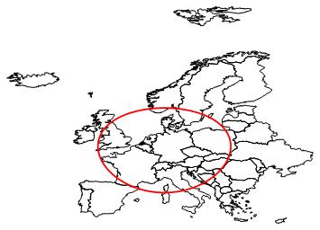 Show[Graphics[ CountryData[#, "Polygon"] & /@ CountryData["Europe"] /. Polygon -> Line], ParametricPlot[ Reverse@GeoDestination[ GeoPosition[CityData["Frankfurt", "Coordinates"]], {1000000, t}][[1]], {t, 0, 360}, PlotStyle -> Directive[Red, Thick]], ImageSize -> Medium ]