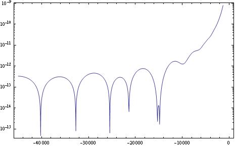 LogPlot[Abs[RiemannR[10^x]], {x, -45000, 2}, Frame -> True, Axes -> False, MaxRecursion -> 4]