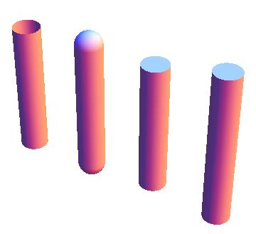 Graphics3D[{ CapForm[None], Tube[{{0, 0, -1}, {0, 0, 1}}, .2], CapForm["Round"], Tube[{{1, 0, -1}, {1, 0, 1}}, .2], CapForm["Butt"], Tube[{{2, 0, -1}, {2, 0, 1}}, .2], CapForm["Square"], Tube[{{3, 0, -1}, {3, 0, 1}}, .2] }, Boxed -> False]