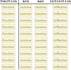Grid[Join[ {{"function", "min", "max", "inflection"}}, Table[Placeholder /@ {"function", "minima", "maxima", "inflection"}, {10}]], Dividers -> {{False, True}, {False, True}}]