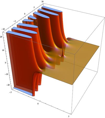 Plot3D[Re@DirichletL[10, 1, u + I v], {u, -5, 5}, {v, -10, 10}, Mesh -> None, BoxRatios -> {1, 1, 1}, PlotPoints -> 35, PlotStyle -> Directive[Opacity[0.8], Orange, Specularity[White, 20]] ]