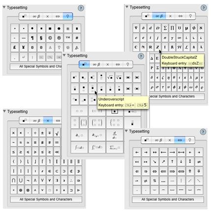 Toolips for all of the Typesetting buttons display symbol name and keystrokes to use for keyboard entry.