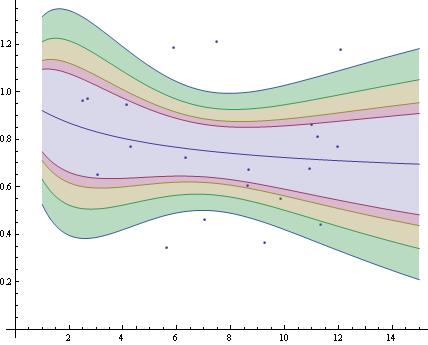 Visualize a fitted nonlinear model along with the data and 90%, 95%, 99% and 99.9% mean prediction confidence bands.