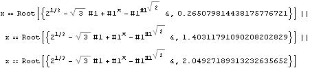 Reduce[x^\[Pi] - x^x^Sqrt[2] - Sqrt[3] x + 2^(1/3) == 0, x, Reals]