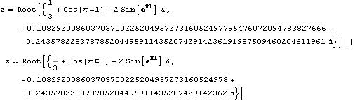 f = 2 Sin[Exp[z]] - Cos[Pi z] - 1/3; rts = Reduce[f == 0 && Abs[z] < 1, z]