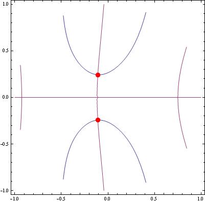 ContourPlot[{Re[f /. z -> x + I y] == 0, Im[f /. z -> x + I y] == 0}, {x, -1, 1}, {y, -1, 1}, RegionFunction -> (Abs[#1 + I #2] < 1 &), Epilog -> {Red, PointSize[0.025], Point[{Re[z], Im[z]}] /. {ToRules[rts]}}]
